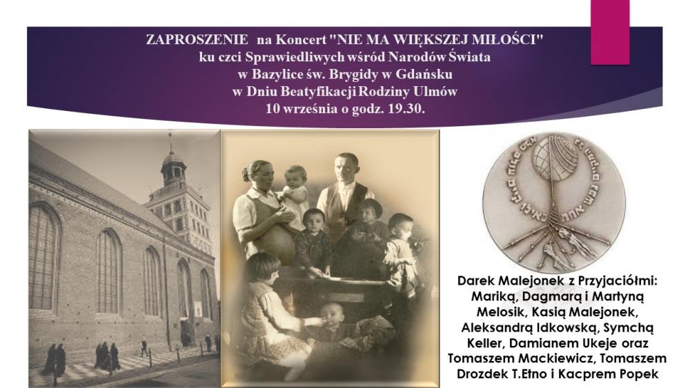 ZAPROSZENIE na Koncert "NIE MA WIĘKSZEJ MIŁOŚCI" ku czci Sprawiedliwych wśród Narodów Świata w Bazylice św. Brygidy w Gdańsku pod patronatem MIIWŚ w Dniu Beatyfikacji Rodziny Ulmów 10 września o godz. 19.30.